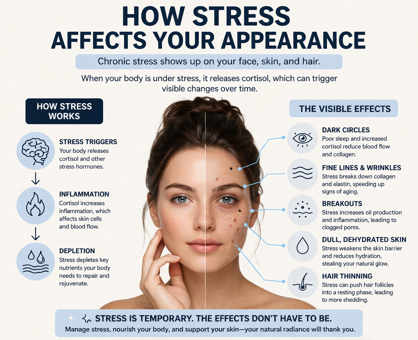 Stress doesn’t just stay internal. It can show up on your face, in your skin texture, and even in your hair. Ongoing stress may contribute to dull-looking skin, dehydration, inflammation, breakouts, and signs of premature aging. It may also play a role in hair shedding or reduced shine and vibrancy.